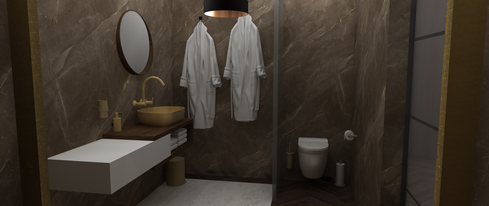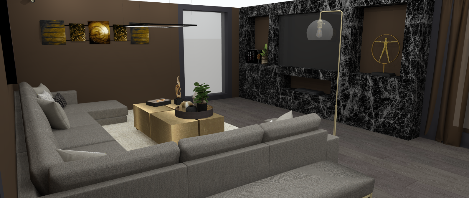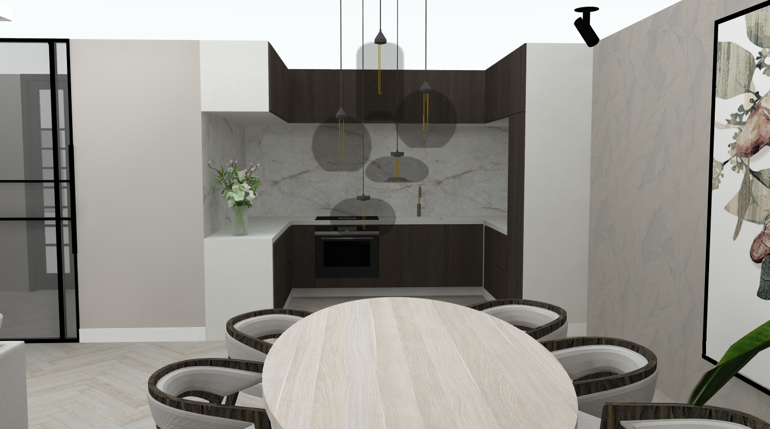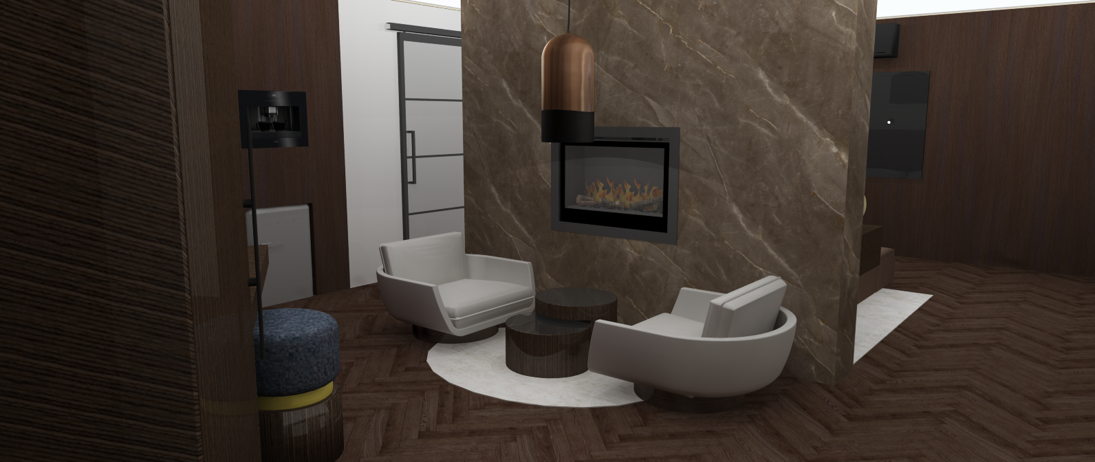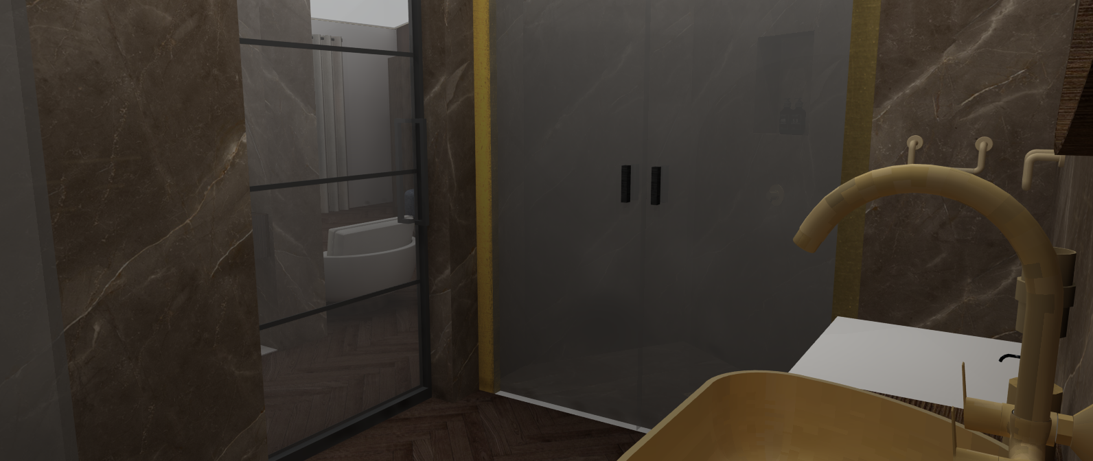 Ik ben erg trots op dit ontwerp. De chique en moderne sfeer heb ik gecreëerd door het gebruik van warme bruine en gouden tinten. Deze kleurencombinatie zorgt voor een warme, uitnodigende uitstraling die tegelijk een modern effect geeft. Daarnaast brengt het marmer in het ontwerp een extra luxe en verfijnde uitstraling aan de ruimte.