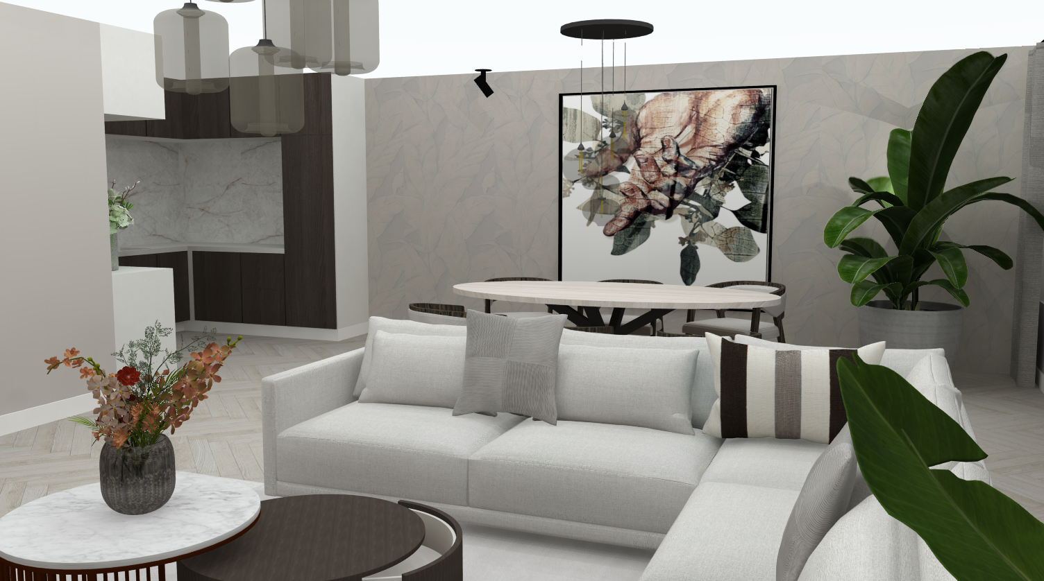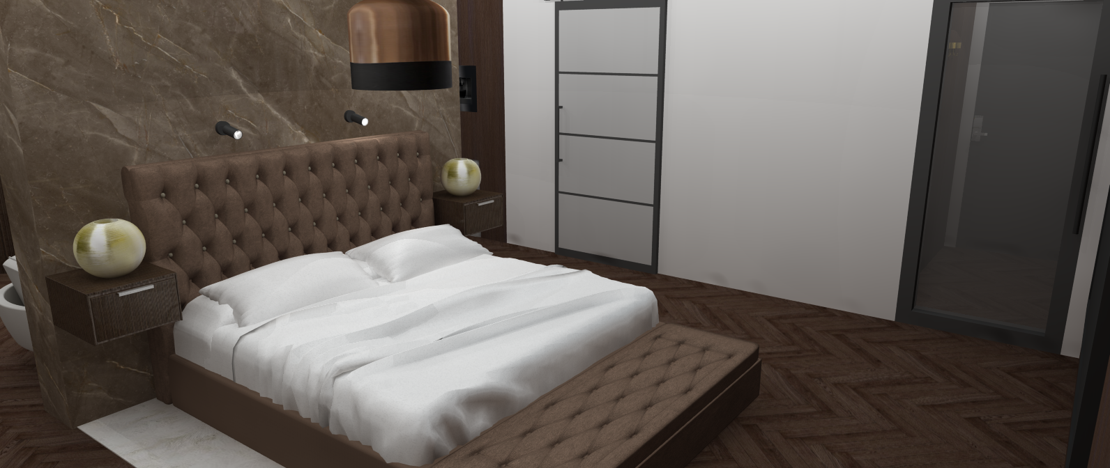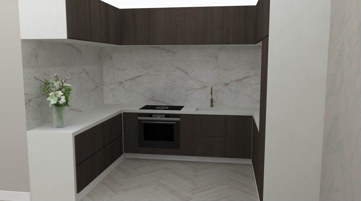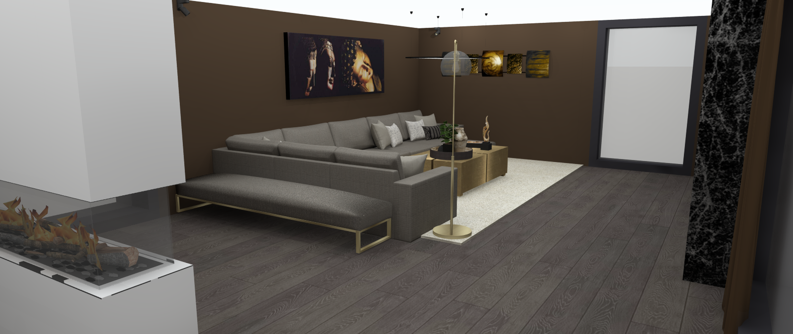 Ik ben erg trots op dit ontwerp. De chique en moderne sfeer heb ik gecreëerd door het gebruik van warme bruine en gouden tinten. Deze kleurencombinatie zorgt voor een warme, uitnodigende uitstraling die tegelijk een modern effect geeft. Daarnaast brengt het marmer in het ontwerp een extra luxe en verfijnde uitstraling aan de ruimte.
