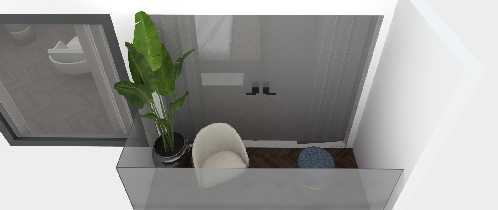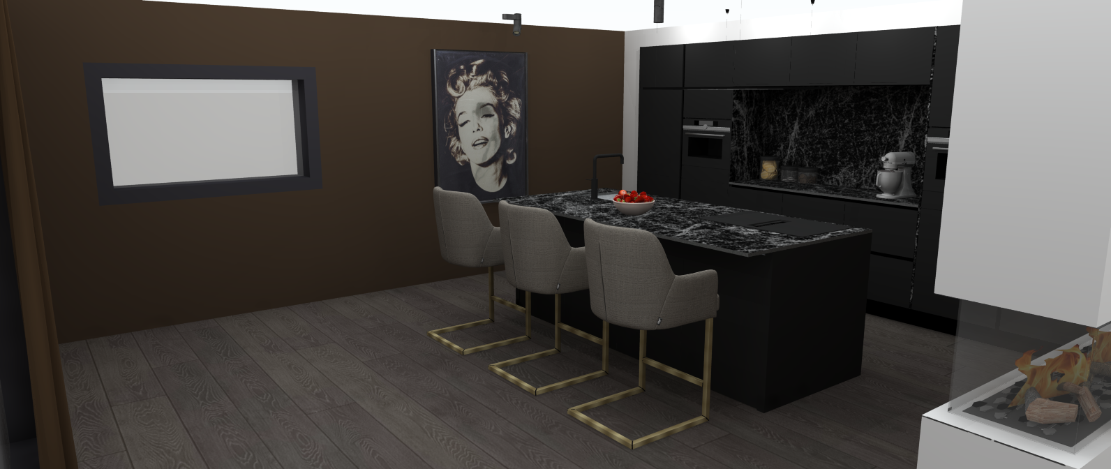Dit project heb ik volledig zelfstandig bedacht. Hoewel het inmiddels wat ouder is, zie ik duidelijk hoe mijn stijl zich in de loop der jaren heeft ontwikkeld. Voor dit ontwerp creëerde ik een fictieve klant die houdt van donkere kleuren, een moderne, chique en intieme sfeer, gecombineerd met een luxe uitstraling.