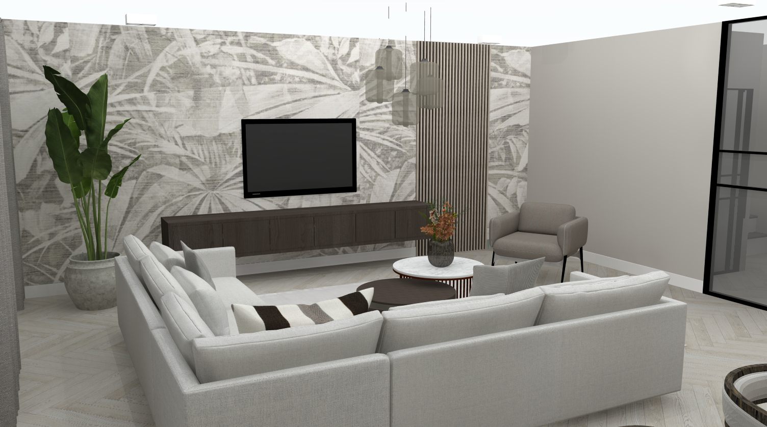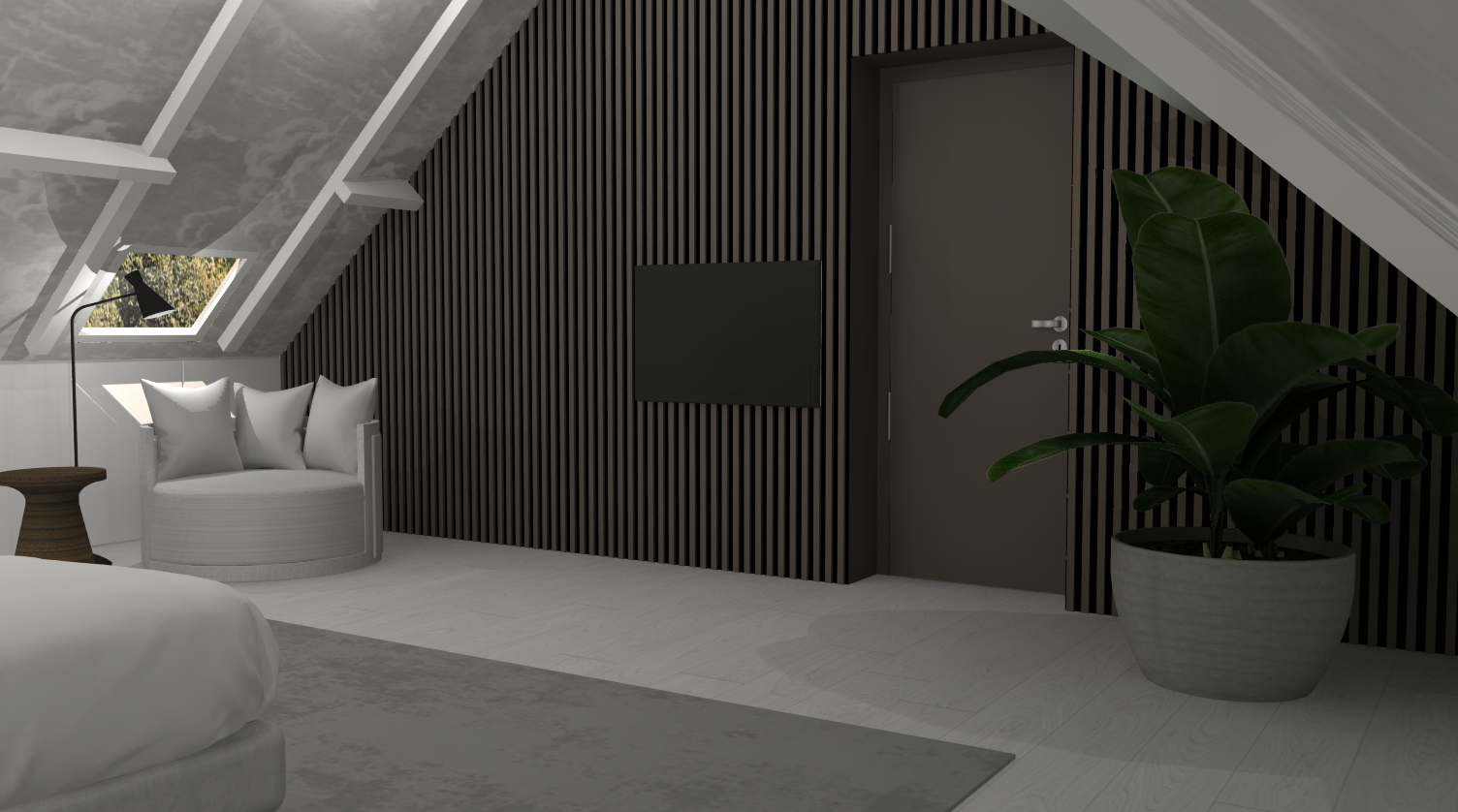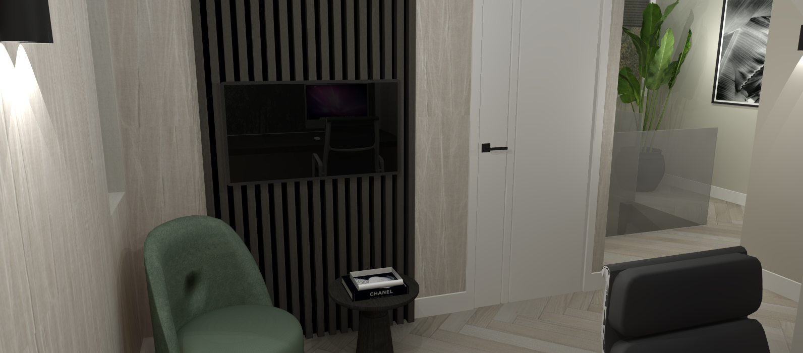 We hebben gekozen voor een lattenwand die de volledige wand beslaat, waarbij de deur in dezelfde kleur is afgewerkt als de lattenwand. Dit zorgt voor een harmonieus en rustig geheel. In een hoek van de kamer is een grote, groene plant geplaatst, tegenover een comfortabele relaxplek. Zo behoudt de klant een aangename plek om te ontspannen, passend binnen de rustige sfeer van de ruimte.
