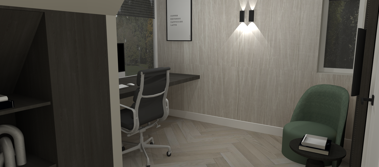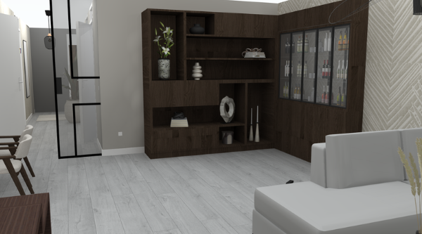 Voor dit project koos ik voor de luxe stijl, omdat ik mezelf wilde uitdagen om alle mogelijkheden en details die deze stijl met zich meebrengt, volledig te benutten. Er waren duidelijke eisen waaraan het ontwerp moest voldoen, zoals het creëren van een relaxplek, voldoende opbergruimte en een koffie- en theefaciliteit.